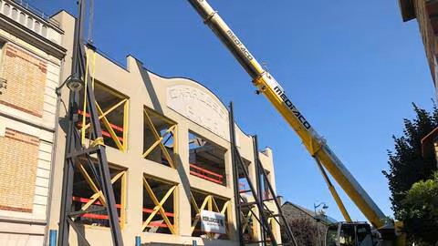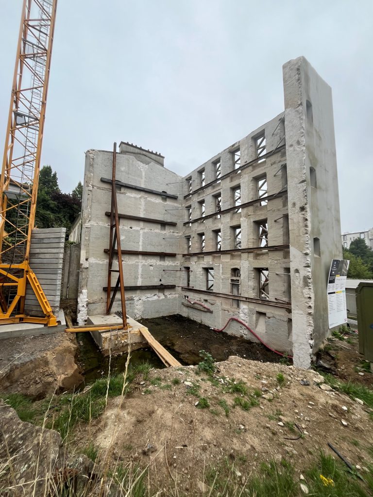 Le chantier « Les Foyers », rue Général Trobriand à Brest, se distingue par une opération de déconstruction particulièrement technique. L’intervention consiste à déconstruire l’ensemble